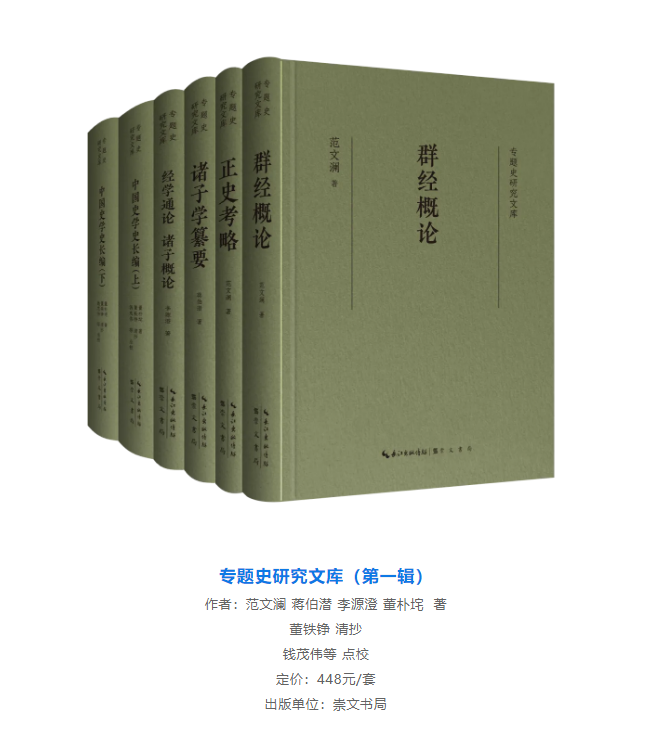 編輯推薦:本套書精選6種中國學術史經典作品,包括著名歷史學家范文瀾的《群經概論》《正史考略》,著名學者蔣伯潛的《諸子學纂要》、李源澄的《經學通論 諸子概論》、董樸垞的《中國史學史長編》。其中,《群經概論》《經學通論》為簡明精當,高屋建瓴的經學史著作;《諸子概論》《諸子學纂要》為敘事清晰,可讀性強的先秦學術史著作;《正史考略》詳細考述二十五史;《中國史學史長編》則是一部上起先秦、下迄民國的首尾完整的中國史學發展通史。《中國史學史長編》為首次點校整理,《群經概論》《正史考略》為首次出版簡體單行本。(鄭小華、何丹、黃振華)
