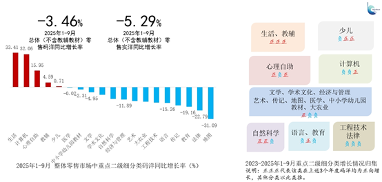 2025年1—9月整體圖書零售市場重點二級門類市場碼洋同比增長率