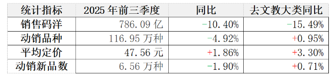 根據中金易云統計,2025年前三季度圖書市場碼洋為786.09億,同比2024年下降10.40%,降幅呈進一步擴大態勢;動銷品種數和動銷新品數也同步下滑,僅平均定價保持上升勢頭。當剔除文教類的剛需產品后,其他大類圖書碼洋降幅15.49%,盡管平均定價同比上升3.30%,但定價的顯著上升仍難以掩蓋市場整體的頹勢。