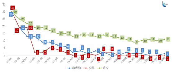進一步以2024年1月三大類總銷量榜前30名為樣本,觀察其在后續月份的留存情況,可見留存品種整體呈波動遞減趨勢。其中,虛構類留存品種相對較多,說明該榜單中常銷書仍占一定比例;而少兒類與非虛構類的留存品種下降尤為明顯。2024年1月少兒類前30名圖書中,在2024年2月和3月仍有19種出現在榜單中,但到2024年4月僅剩2種,至2024年9月已無重合品種,表明榜單上榜品種已完全更替。這一變化趨勢說明,大多數暢銷書依賴密集的營銷資源在短期內引爆市場,短暫上榜后便被新一輪的營銷洪流淹沒。