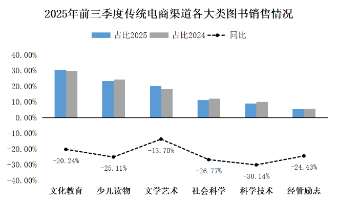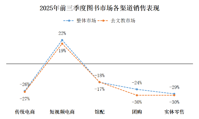 2025年前三季度整體圖書市場中,各渠道占比呈現穩定格局。其中,傳統電商和短視頻電商渠道占比接近1:1,二者共同構成圖書市場的核心銷售渠道,在整體市場份額中占據主導地位。