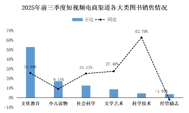 短視頻電商渠道在經歷前期高速擴張期后,當前市場成熟度顯著提升,整體短視頻渠道基本形成“一超多強”的競爭態勢,在2025年的增速基本保持在20%左右。從各大類圖書銷售表現來看,僅經管勵志類同比微降,但降幅較上半年時顯著收窄,其余各大類圖書均呈現正增長的勢態,且文教、少兒和文藝類圖書增幅進一步擴大。