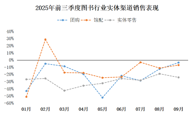 經中金易云數據監測顯示,截至2025年前三季度,圖書行業實體渠道降幅23.66%,較上半年度(降幅34.68%)有所收窄。從按月銷售情況來看,在第三季度,團購和館配渠道的降幅有一定的收窄,主要是受到部分科技和文藝類圖書的銷售拉升,而實體零售渠道降幅則仍與前幾個月基本持平。