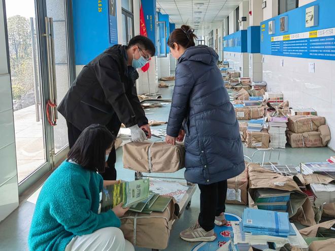 為防范近期極端天氣帶來的不良影響,保證各項(xiàng)工作高質(zhì)高效完成,分公司早行動、早安排,全體人員兵分兩路,一路負(fù)責(zé)對到貨的教材進(jìn)行清點(diǎn)、標(biāo)記、打包,另一路則負(fù)責(zé)將教材配送到校并做好對接工作。大家相互配合、通力合作,截至2月19日下午,已完成13個鄉(xiāng)鎮(zhèn)、2個街道辦、8個市直中小學(xué)以及3所高中的春季教材配送到校工作。