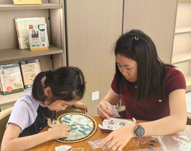 活動現場,連鎖店工作人員首先展示了宋代緙絲工藝的獨特技法,詳細講解錦線配色、珍珠鑲嵌等制作要領。隨后,親子家庭認真裁剪錦緞、設計紋樣,粘貼珍珠。家長與孩子們默契配合,在指尖流轉中感受傳統工藝的精妙,現場洋溢著濃厚的學習氛圍。