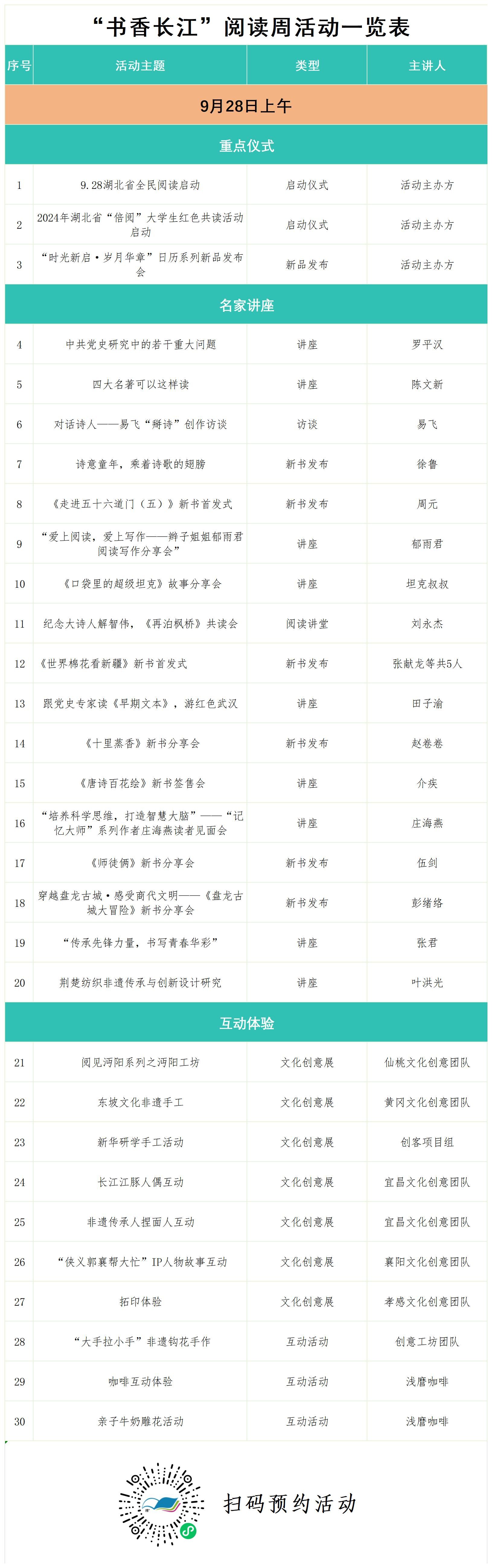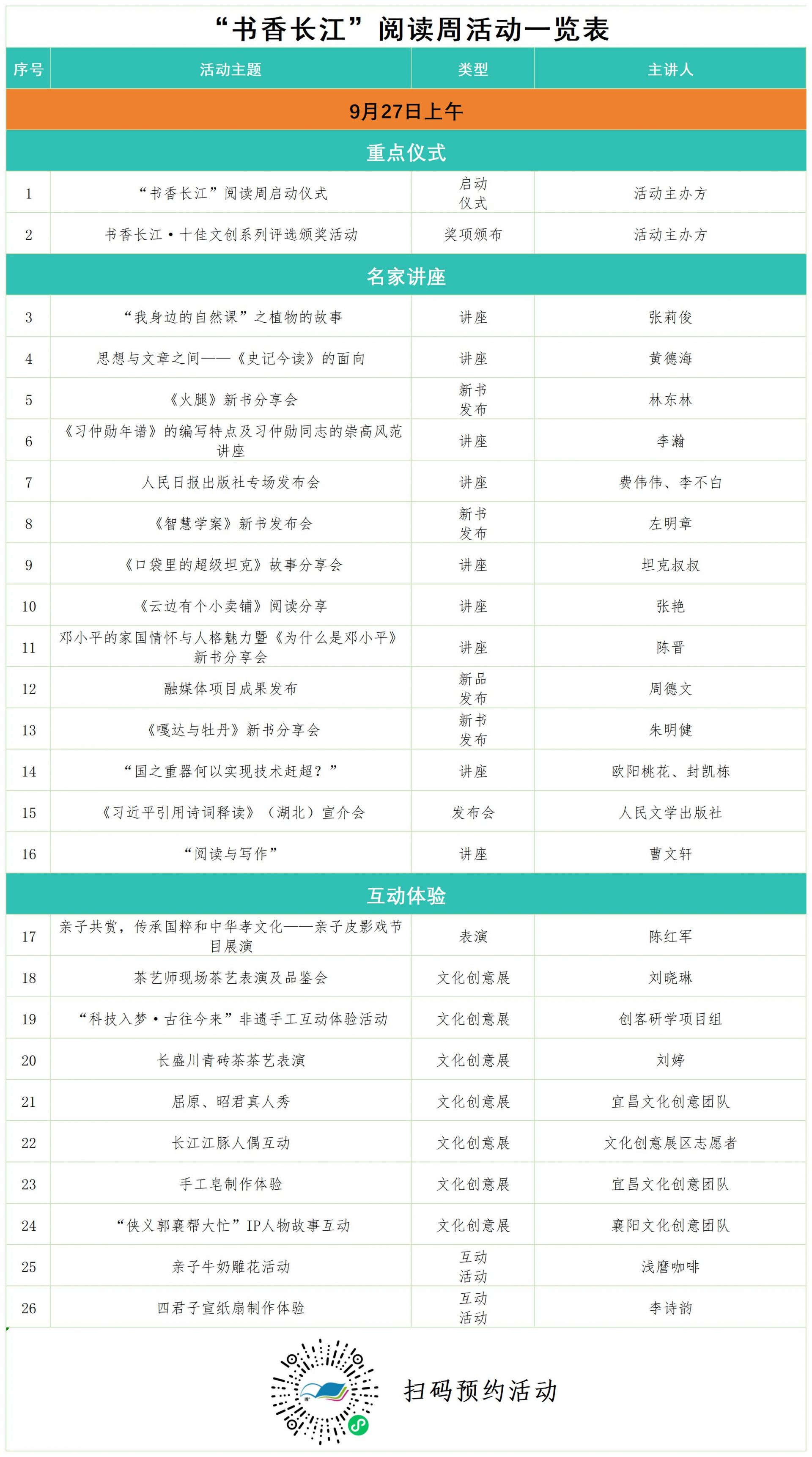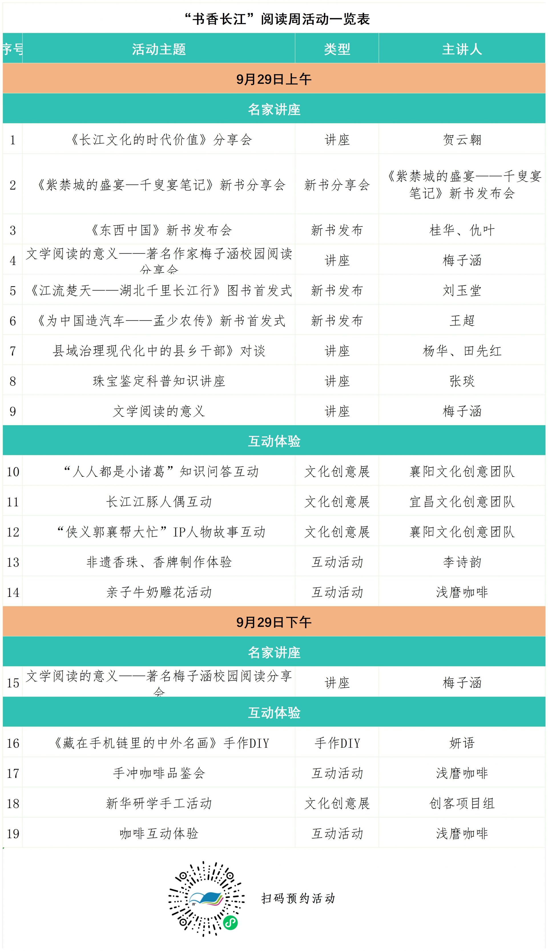 按照安排,將舉辦“書香長江”閱讀周?武漢書展暨第19屆華中圖書交易會啟動儀式、“書香長江”9·28全民閱讀周啟動儀式、倍閱大學生紅色共讀活動啟動儀式、書香長江?十佳文創產品”“書香長江?十佳荊楚禮物”“書香長江?十佳文創企業”系列評選活動、名家講座與名作分享活動、“品味長江·文化共享”館社店交流研討會暨“百場講書讀荊楚”全省巡講活動啟動儀式、“書香長江”閱讀周?武漢書展閱讀嘉年華十大文化惠民活動等100多項精彩紛呈的文化活動。