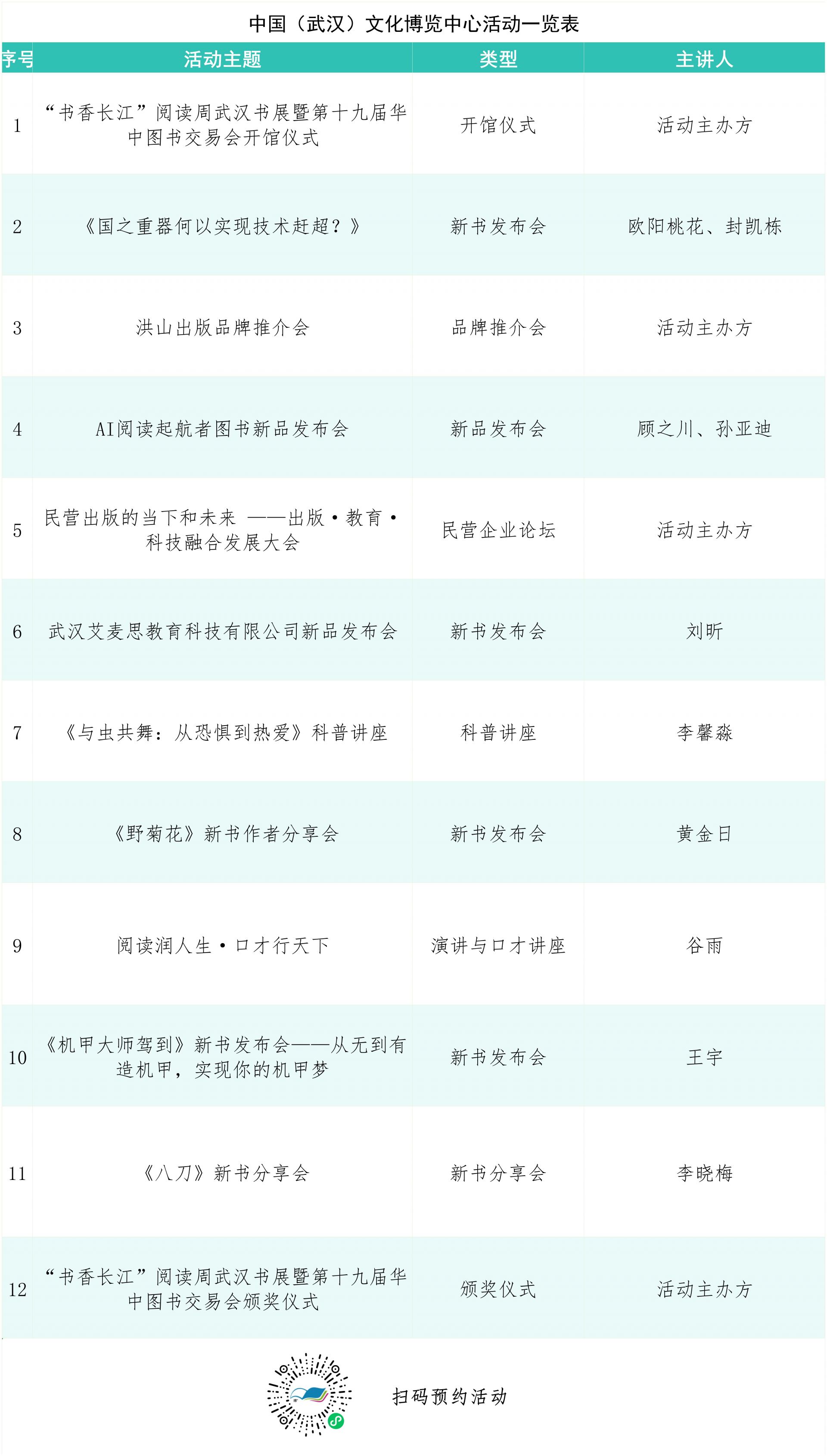 在武漢國際會展中心、中國(武漢)文化博覽中心兩個展區以及高校和圖書館,將廣泛舉辦名家講座、新書發布與名作分享活動,陳彥、張煒、敬一丹、柳建偉、劉醒龍、東西、童慶禧、張獻龍、曹文軒、沈石溪、徐魯、李舫、賀云翱、莫礪鋒、陳文新、六小齡童等60余位名人名家將參加本屆展會,聚焦文學、主題教育、人文歷史、青少年閱讀等領域進行深入交流,并同步進行線上直播互動。