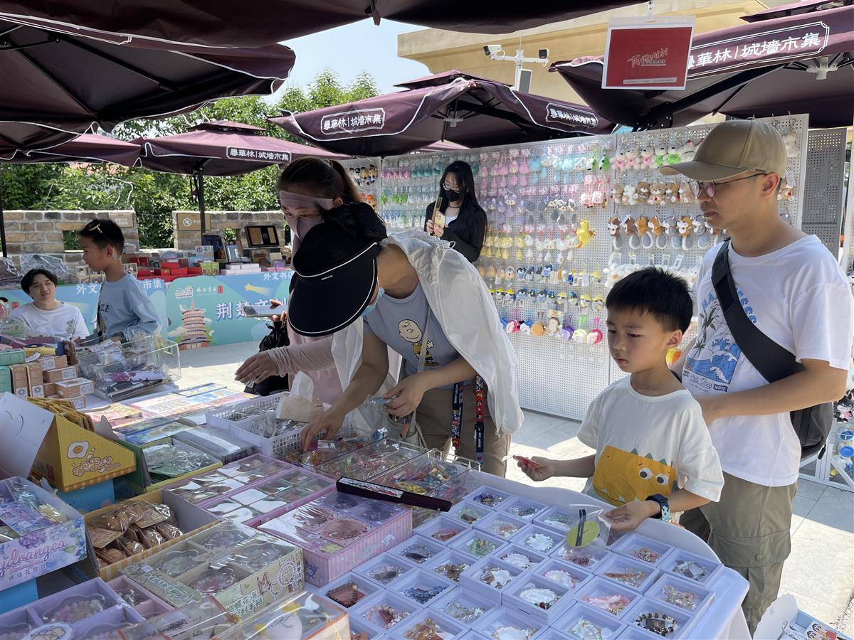 市集聯合非遺傳承人、本土設計師推出“黃鶴樓”“熱干面”等相關文創產品,將黃鶴樓、戶部巷等文化IP轉化為可感知、可傳播的現代文創符號。湖北省新華書店集團自有文創品牌秉持“閱讀+生活”美學理念,文具、手賬、藝術衍生品等兼具實用性與設計感的文創產品備受游客青睞。“黃鶴樓”帆布包、“熱干面”盲盒、“倍悅文創”四季之愛……從非遺手作到方言周邊,從地標文創到潮流玩物,集市上琳瑯滿目的文創產品承載著武漢文化記憶。