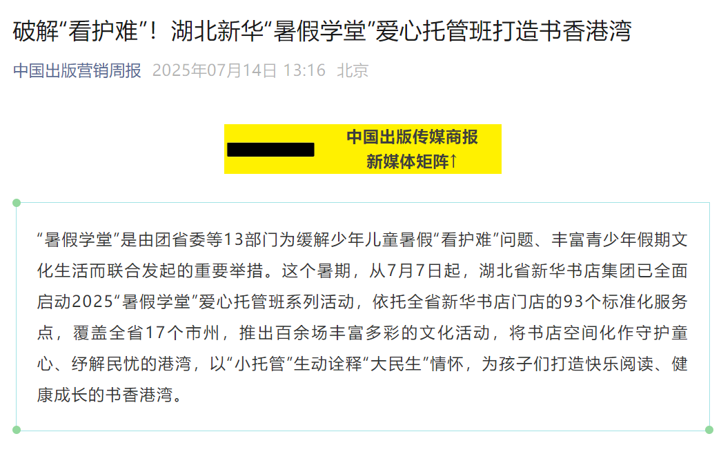 中國出版營銷周報 | 破解“看護難”!湖北新華“暑假學堂”愛心托管班打造書香港灣
