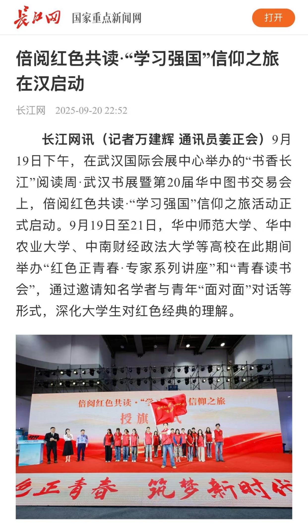 9月19日下午,在武漢國際會展中心舉辦的“書香長江”閱讀周·武漢書展暨第20屆華中圖書交易會上,倍閱紅色共讀·“學習強國”信仰之旅活動正式啟動。9月19日至21日,華中師范大學、華中農業大學、中南財經政法大學等高校在此期間舉辦“紅色正青春·專家系列講座”和“青春讀書會”,通過邀請知名學者與青年“面對面”對話等形式,深化大學生對紅色經典的理解。