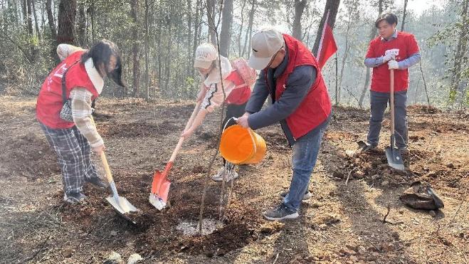 活動現場,嵩陽林場指導老師首先給志愿者們講解了植樹注意事項,他告訴大家,武漢年初的兩場凍雨對林場植被造成了嚴重損害,急需在此苗木種植黃金期補充新苗。志愿者們迫切希望為提升家園綠化水平、改善城市生態環境、繪就美麗中國畫卷貢獻力量,便踴躍拿起鐵鍬、提起水桶,投入到緊張有序的植樹活動中。