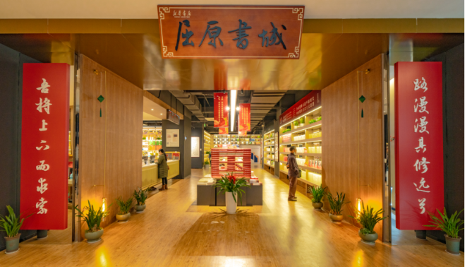 書城以屈原文化為內涵,注重傳承、傳播和弘揚傳統文化。書城整體設計風格以楚文化為依托、融合地方特色文化與人文風情,體現出書店功能需求與屈原文化的完美交融。書城共分為9大區域、12個主題展區。其空間布局呈現“九思、天問、橘頌、九章”等架構,名稱均源于《楚辭》,旨在引領讀者探尋屈原的精神世界,領略國學之美,感受古風古韻。設有屈原文化專區、橘頌文化墻、楚辭名句展示墻及書畫長廊等藝術場景,全面且多元地展現屈原文化及其精神內核;將傳統經典文化與現代閱讀體驗相結合,常態化邀請文化名家開展屈原文化相關新書分享、好書薦讀、論壇講座等活動,引領傳統經典文化走向大眾,陪伴市民讀者在閱讀的道路上上下求索,尋覓真知。