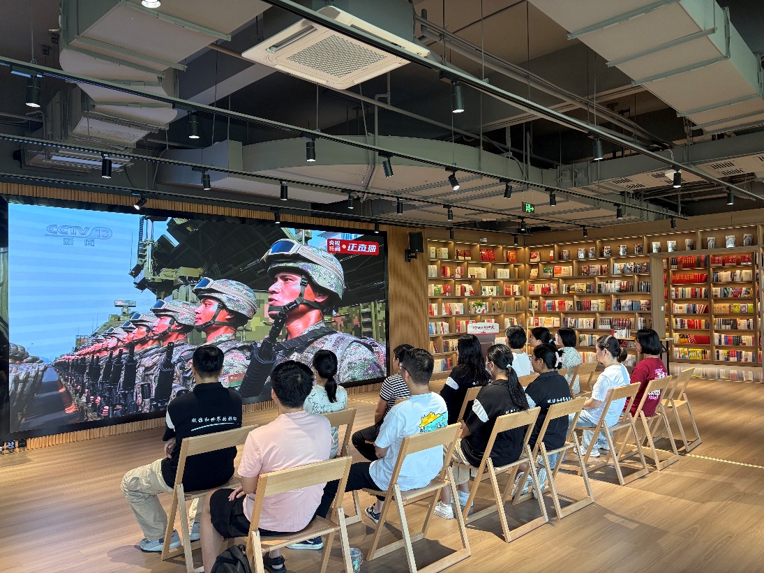 在外文書店,自發前來的讀者們和書店員工一起聚精會神地觀看了莊嚴的閱兵儀式。